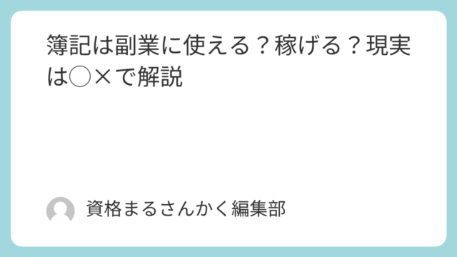 副業 簿記は副業に使える?稼げる?現実は◯×で解説 簿記は副業に使える?結論は「簿記だけでは稼げない」。副業案件の現実、稼げない理由、実務経験や別スキルとの組み合わせ方を◯×で分かりやすく解説します。 2026.01.09 副業社会人向け資格簿記